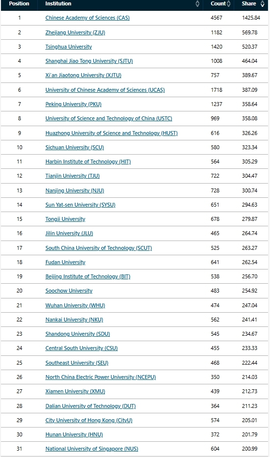 The Chinese Academy of Sciences (CAS), by far China's largest research organization, led the ranking, with Zhejiang University securing the second spot. The first non-Chinese institution to appear was the National University of Singapore, which placed 31st.
