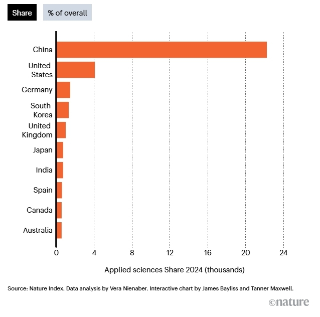 In the first Nature Index in applied sciences, researchers based in China contributed to a commanding 56% of the total output, achieving a Share of 22,261. The United States was a distant second with a Share of 4,099, which equates to just 10% of the year's total. Germany, South Korea, the United Kingdom, Japan, and India follow in that order. This means that China's applied sciences output alone surpasses the combined total of the six countries ranked from second to seventh.