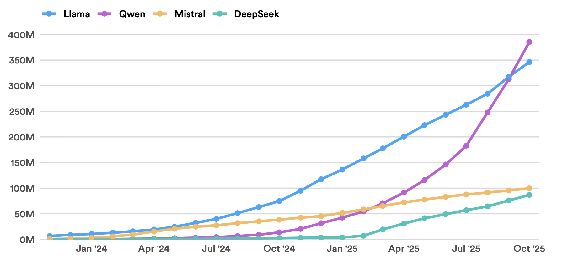 Cumulative downloads of major open-source LLMs on Hugging Face from Nov 2023 to Oct 2025 [Stanford University]