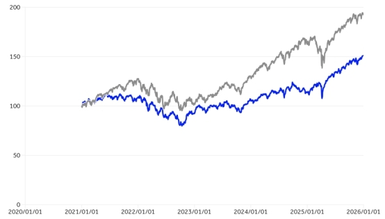 FTSE All-World ex US Index (in grey)v.s. FTSE USA Index (in blue). Graphics from London Stock Exchange Group.