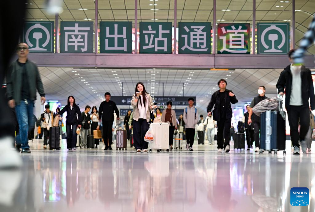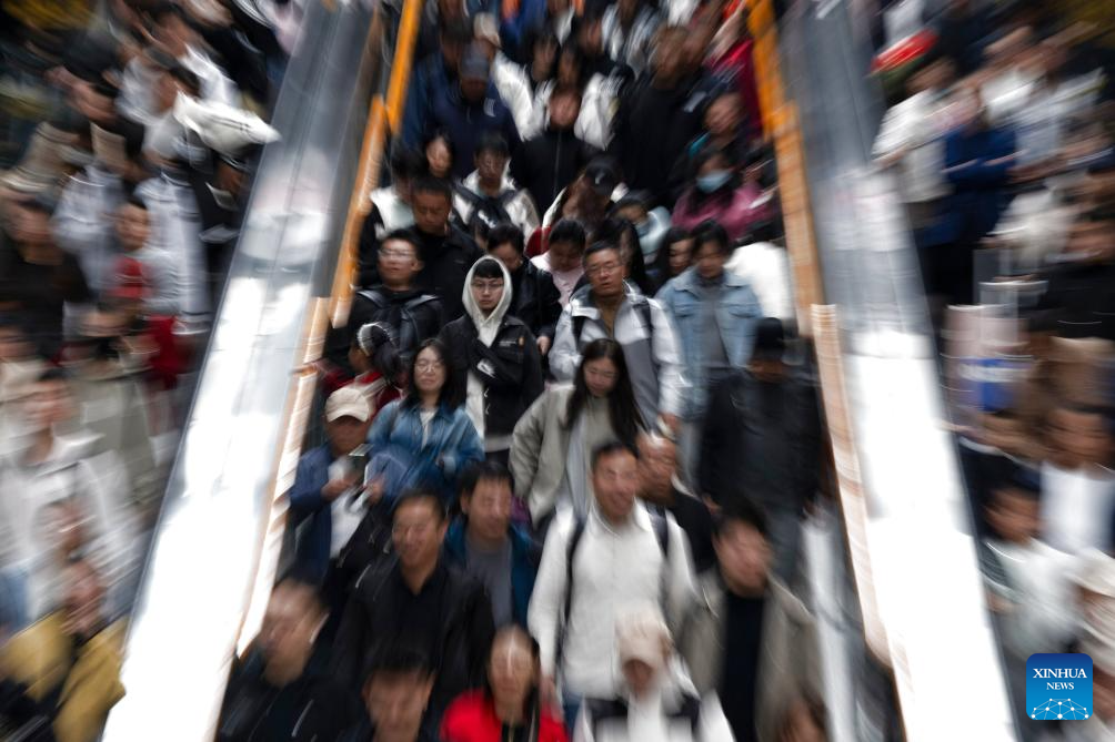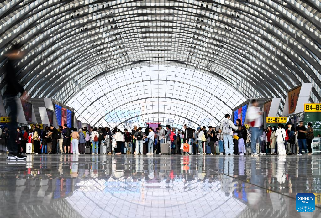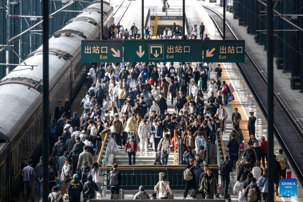 Passengers are pictured at Harbin Railway Station in Harbin, northeast China's Heilongjiang Province, Oct. 7, 2025. As the National Day and Mid-Autumn Festival holiday is drawing to a close, return travel flows increase across the country. (Xinhua/Zhang Tao)