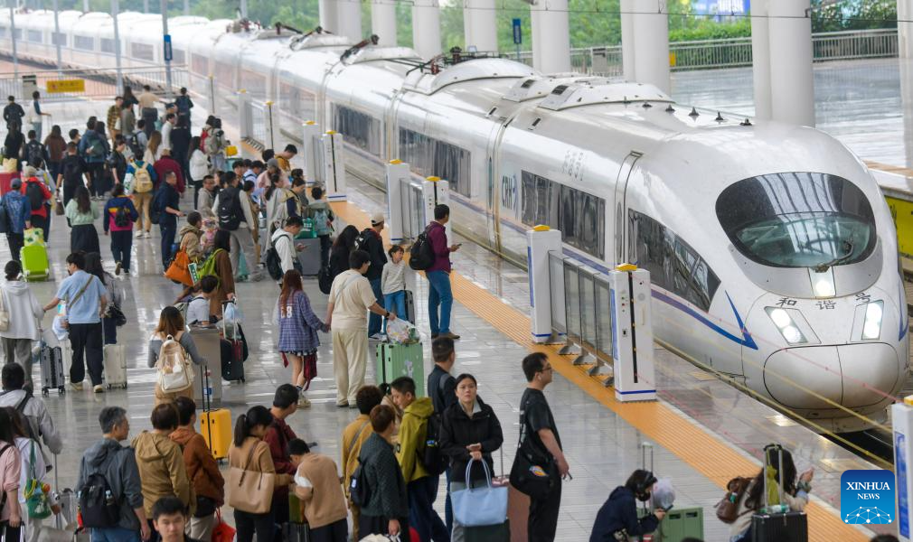 Passengers wait to board a train at Luoyang Longmen Railway Station in Luoyang, central China's Henan Province, Oct. 7, 2025. As the National Day and Mid-Autumn Festival holiday is drawing to a close, return travel flows increase across the country. (Photo by Zhang Yixi/Xinhua)