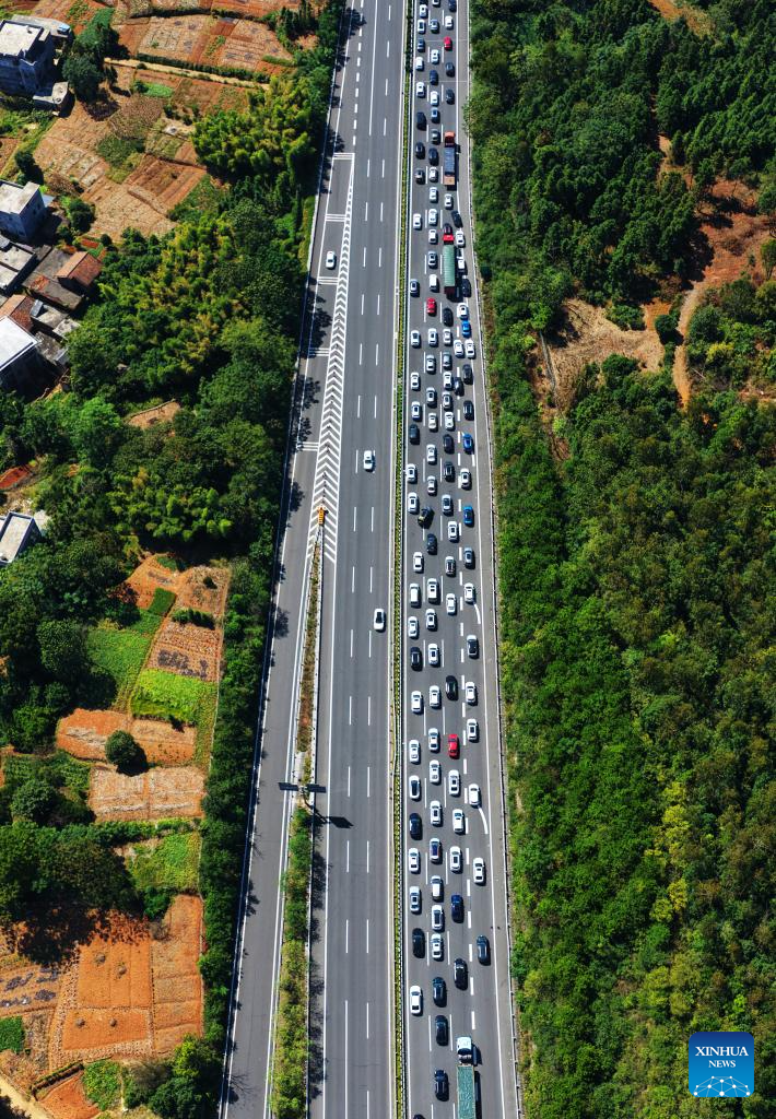 A drone photo taken on Oct. 7, 2025 shows the traffic flow of a highway in Chenzhou, central China's Hunan Province. As the National Day and Mid-Autumn Festival holiday is drawing to a close, return travel flows increase across the country. (Photo by Huang Chuntao/Xinhua)