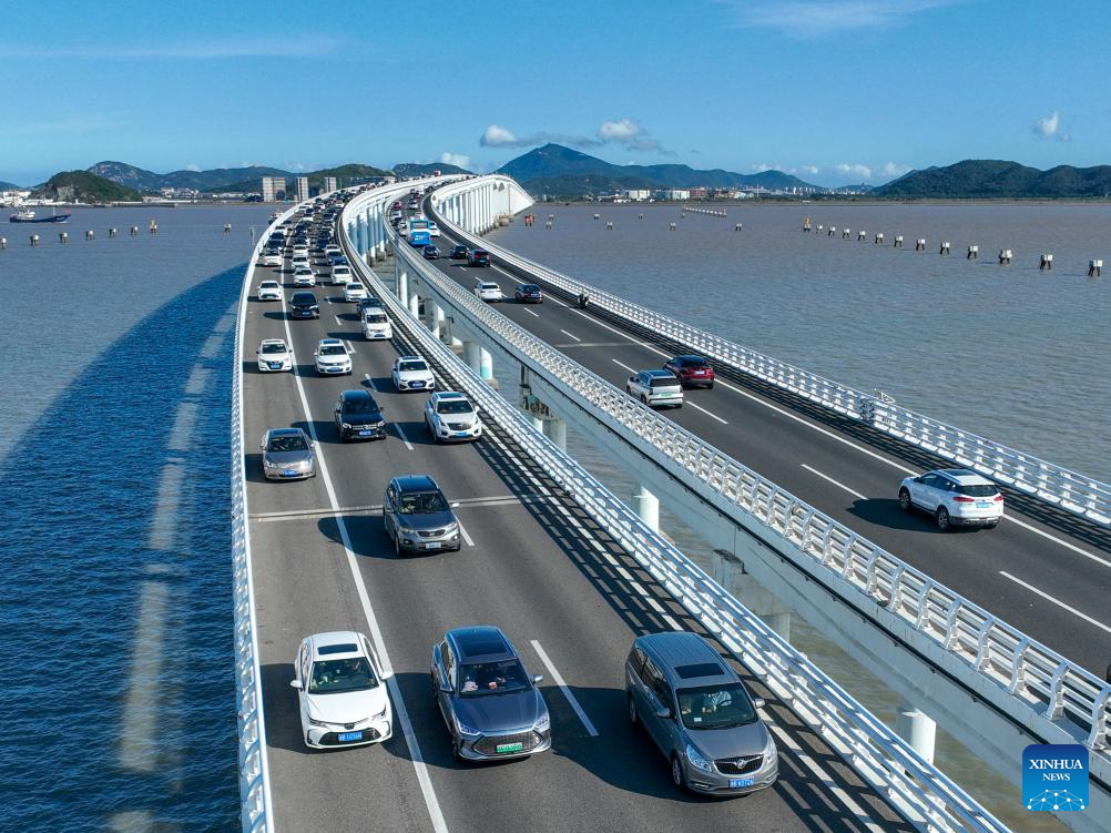 A drone photo taken on Oct. 7, 2025 shows vehicles running on a bridge in Zhoushan, east China's Zhejiang Province. As the National Day and Mid-Autumn Festival holiday is drawing to a close, return travel flows increase across the country. (Photo by Zou Xunyong/Xinhua)