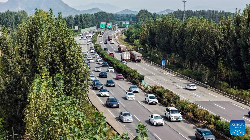 A drone photo taken on Oct. 7, 2025 shows the traffic flow of a highway in Zunhua, north China's Hebei Province. As the National Day and Mid-Autumn Festival holiday is drawing to a close, return travel flows increase across the country. (Photo by Liu Mancang/Xinhua)