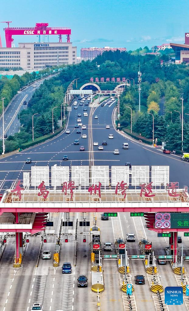 A drone photo taken on Oct. 7, 2025 shows the traffic flow of the Jiaozhou Bay tunnel in Qingdao, east China's Shandong Province. As the National Day and Mid-Autumn Festival holiday is drawing to a close, return travel flows increase across the country. (Photo by Zhang Jingang/Xinhua)