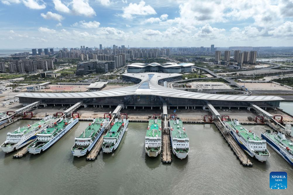 An aerial drone photo taken on Oct. 7, 2025 shows vehicles driving onto ro-ro ships at a port in Haikou, south China's Hainan Province. As the National Day and Mid-Autumn Festival holiday is drawing to a close, return travel flows increase across the country. (Xinhua/Zhang Liyun)