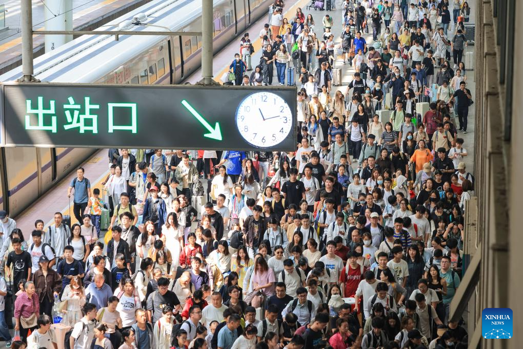 Passengers walk out of an exit passage of Tianjin West Railway Station in Tianjin, north China, Oct. 7, 2025. As the National Day and Mid-Autumn Festival holiday is drawing to a close, return travel flows increase across the country. (Xinhua/Zhao Zishuo)