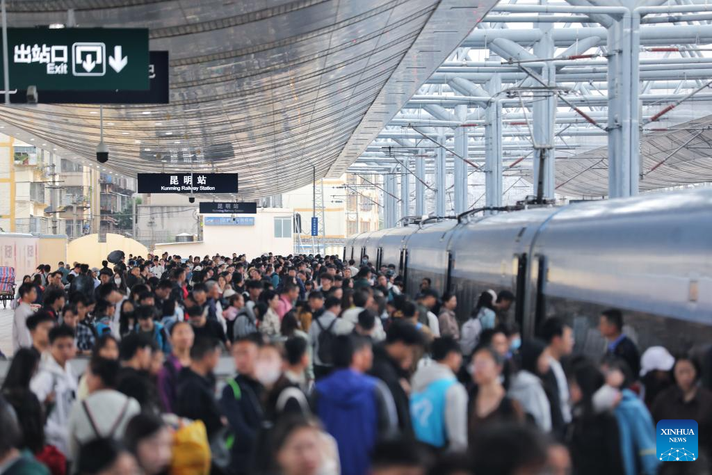 People board a train at Kunming Railway Station in Kunming, southwest China's Yunnan Province, Oct. 7, 2025. As the National Day and Mid-Autumn Festival holiday is drawing to a close, return travel flows increase across the country. (Photo by Yang Zixuan/Xinhua)