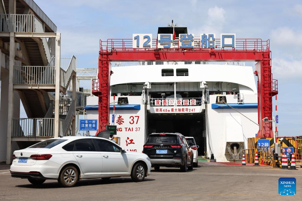 Vehicles drive onto a ro-ro ship at a port in Haikou, south China's Hainan Province, Oct. 7, 2025. As the National Day and Mid-Autumn Festival holiday is drawing to a close, return travel flows increase across the country. (Xinhua/Zhang Liyun)