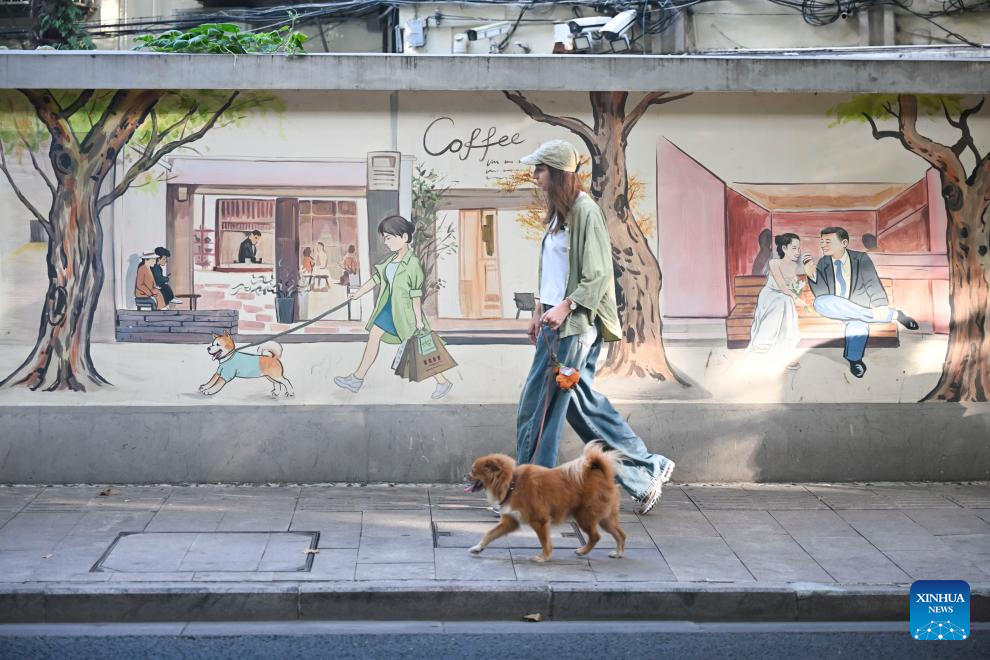 Clarisse Le Guernic takes a walk with her dog Liulian on Nanchang Road in east China's Shanghai, Sept. 22, 2025.