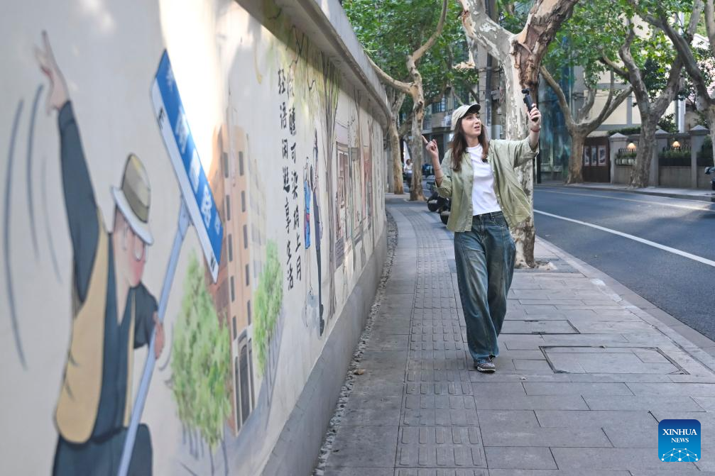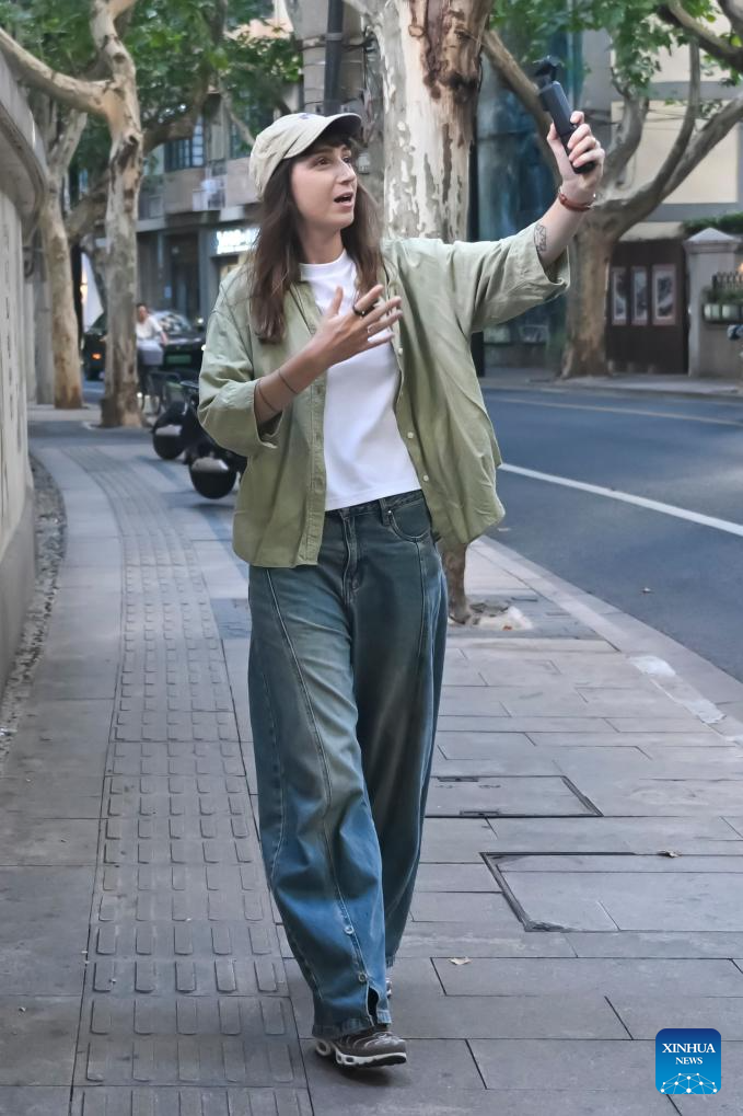 Clarisse Le Guernic takes videos at Nanchang Road in east China's Shanghai, Sept. 22, 2025.(Xinhua/Chen Haoming)