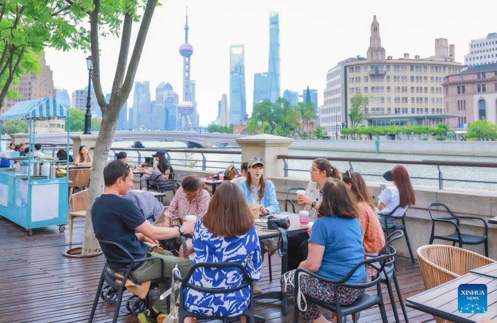 Clarisse Le Guernic (C) takes a break while guiding a group of tourists in east China's Shanghai, May 13, 2025.(Xinhua)