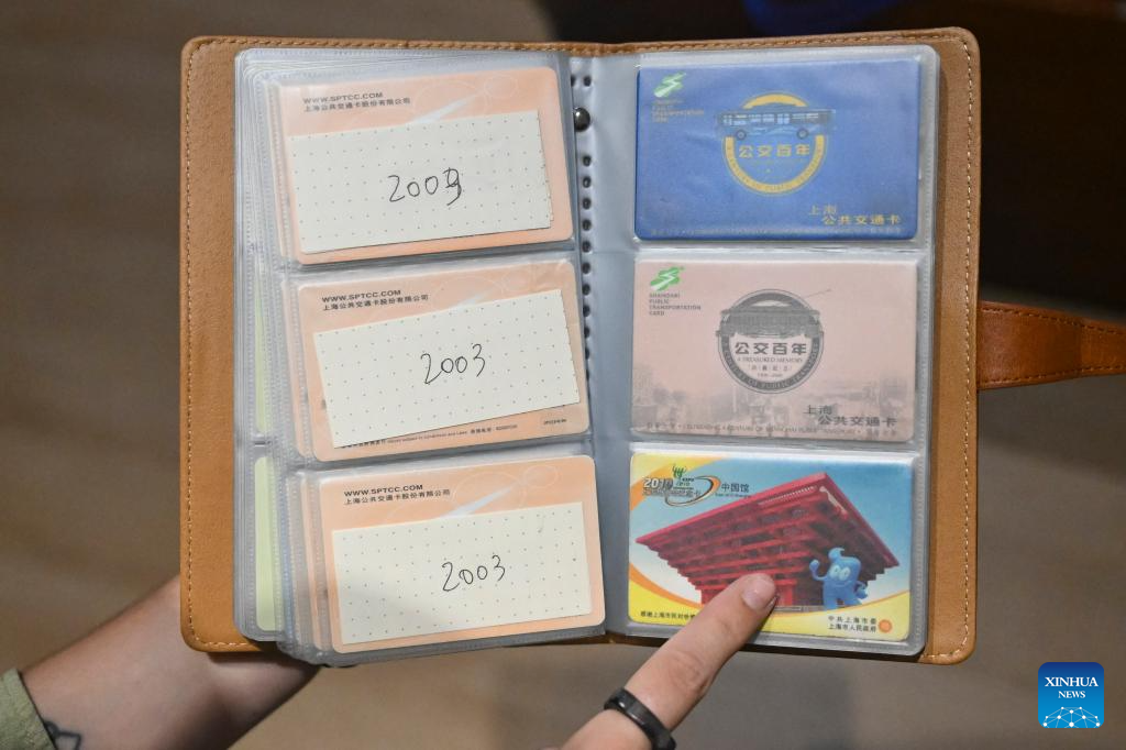 Clarisse Le Guernic displays Shangai public transportation cards that she collected in east China's Shanghai, Sept. 22, 2025.(Xinhua/Chen Haoming)