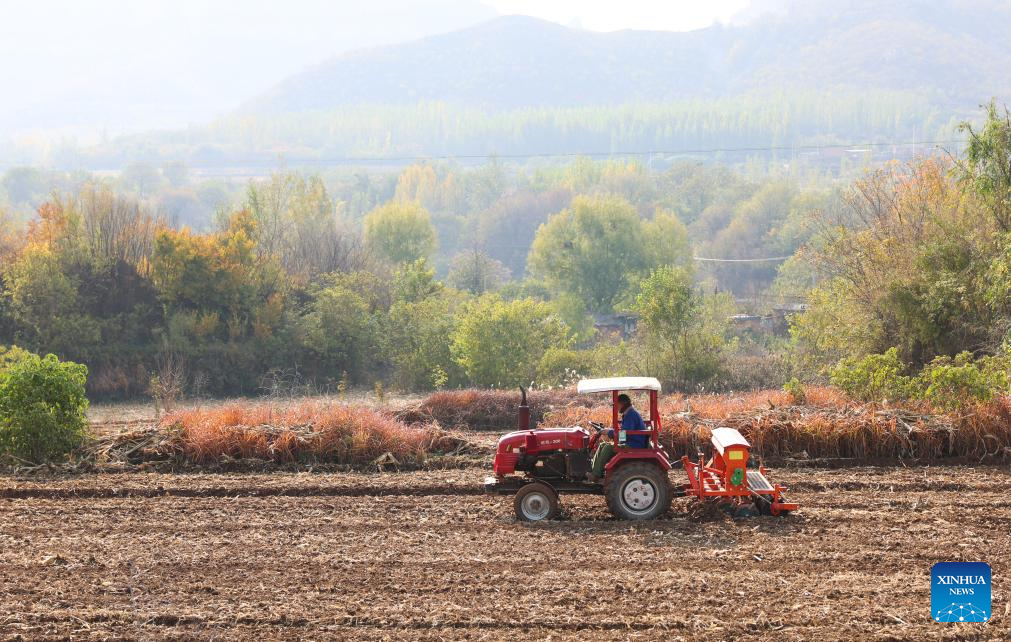 A farmer sows wheat in a field in Xinle City, north China's Hebei Province, Nov. 1, 2025. As of October 30, over 90% of the autumn grain have been harvested and over 25% of the winter wheat have been sowed across the country. (Photo by Jia Minjie/Xinhua)