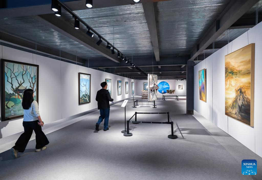 Tourists visit an art exhibition during an internet life carnival at the Puyuan Fashion Resort in Tongxiang City of Jiaxing, east China's Zhejiang Province, Nov. 5, 2025. The internet life carnival kicked off here on Wednesday and will last till Nov. 9. The event integrates technology exhibition, consumer goods and entertainment products into the resorts' fashion lifestyle industry, allowing visitors to experience various scenarios where digital civilization enhances quality of life. (Xinhua/Xu Yu)