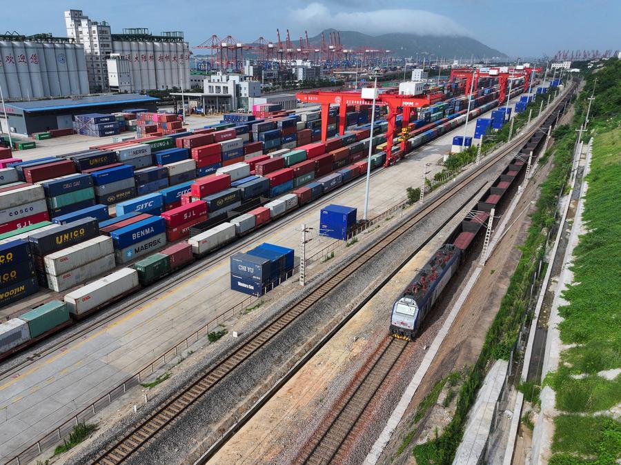 An aerial drone photo shows the China-Kazakhstan (Lianyungang) Logistics Cooperation Base in Lianyungang, east China's Jiangsu Province, July 25, 2024. (Xinhua/Li Bo)