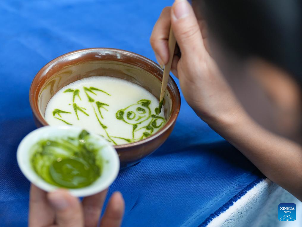 A tea technician draws a panda pattern while making tea at an expo of panda-themed cultural and creative products in Chengdu, southwest China's Sichuan Province, Nov. 21, 2025.