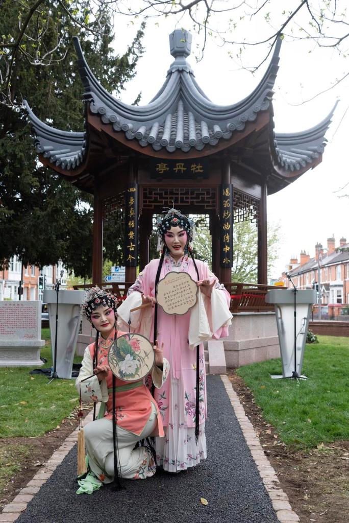 This file photo taken on April 26, 2019 shows Chinese artists posing for a photo in front of the Peony Pavilion at the Firs Garden in Stratford-upon-Avon, Britain. (Photo by Ray Tang/Xinhua)