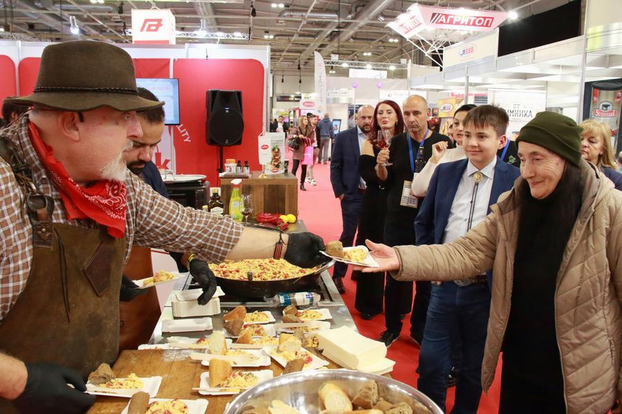 Visitors line up to taste food at the International Food Exhibitions 2025 in Sofia, Bulgaria, Nov. 12, 2025. The four-day event kicked off here at the Inter Expo Center on Wednesday, bringing together five exhibitions dedicated to the food and beverage, meat, dairy, bakery, and wine industries. (Photo by Marian Draganov/Xinhua)