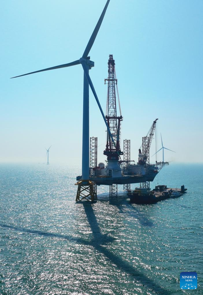 This drone photo taken on Jan. 13, 2026 shows the 20-megawatt offshore wind turbine unit after installation in the coastal waters of southeast China's Fujian Province. The wind turbine unit was successfully hoisted and installed here on Tuesday. (Xinhua/Lin Shanchuan)