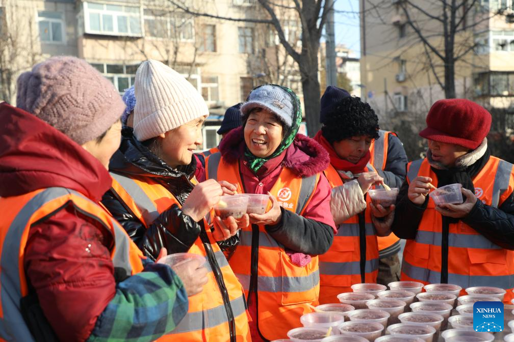 Sanitation workers taste Laba porridge served by volunteers in Fengrun District of Tangshan, north China's Hebei Province, on Jan. 25, 2026. Various activities were held across the country to celebrate the Laba Festival that falls on Jan. 26 this year. (Photo by Zhu Dayong/Xinhua)