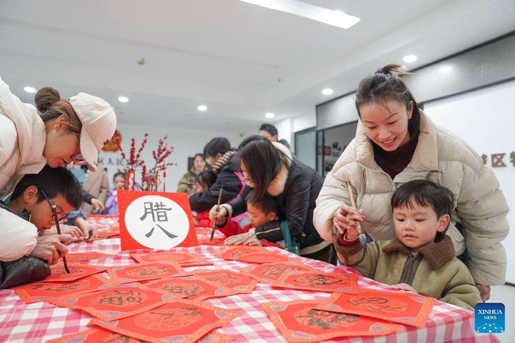 Children and their parents participate in an event in celebration of the Laba Festival in Wenzhou, east China's Zhejiang Province, on Jan. 25, 2026. Various activities were held across the country to celebrate the Laba Festival that falls on Jan. 26 this year. (Photo by Su Qiaojiang/Xinhua)