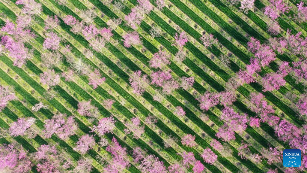 An aerial drone photo taken on March 30, 2026 shows flowers blooming in Zunhua, north China's Hebei Province. (Photo by Liu Mancang/Xinhua)