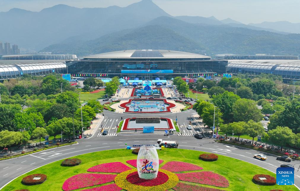 An aerial drone photo taken on April 28, 2026 shows Fuzhou Strait International Conference & Exhibition Center, Fuzhou, southeast China's Fujian Province. The AI market kicked off here ahead of the 9th Digital China Summit, which will convene in Fuzhou from April 29 to 30. (Xinhua/Lin Shanchuan)