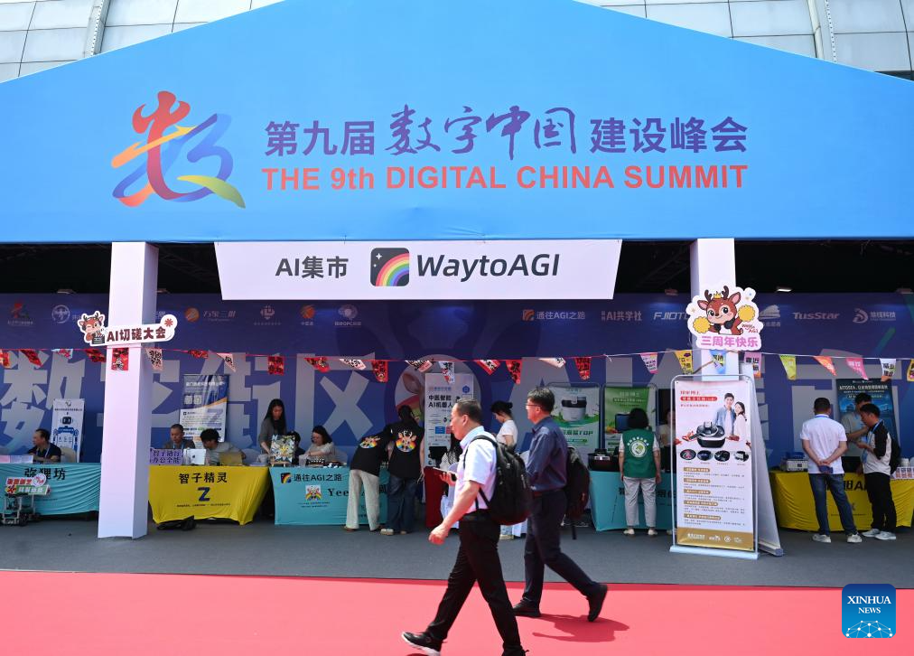 People visit an artificial intelligence (AI) market in Fuzhou Strait International Conference & Exhibition Center, Fuzhou, southeast China's Fujian Province, April 28, 2026. The AI market kicked off here ahead of the 9th Digital China Summit, which will convene in Fuzhou from April 29 to 30. (Xinhua/Lin Shanchuan)