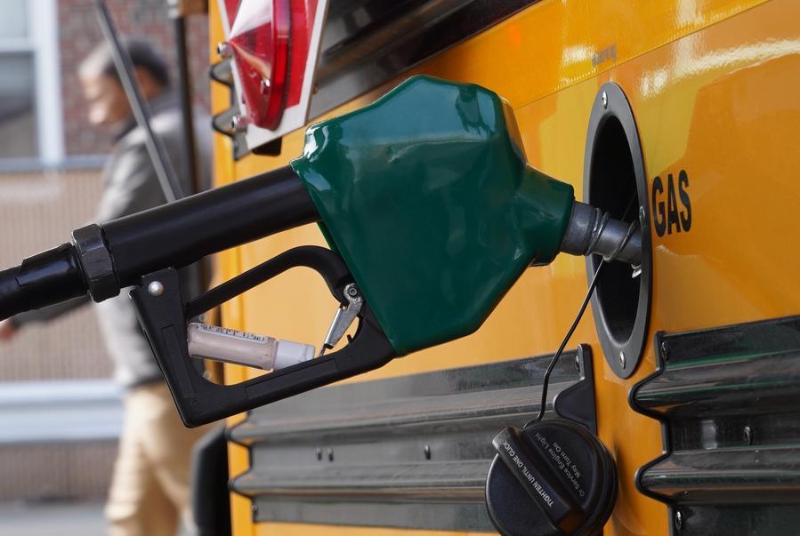Photo taken on March 31, 2026 shows a pump plugged into a school bus at a gas station in New York, the United States. (Xinhua/Zhang Fengguo)
